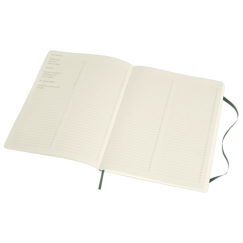 large, ruled, hard cover notebook rounded corners, elastic closure and matching ribbon bookmarks ivory-colored, 100 g/m², acid-free paper: ruled In