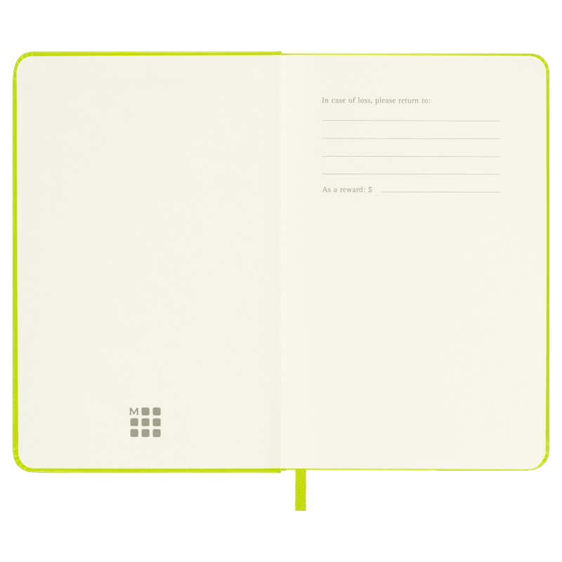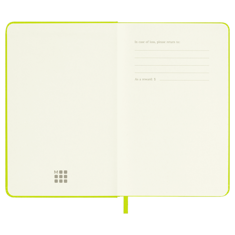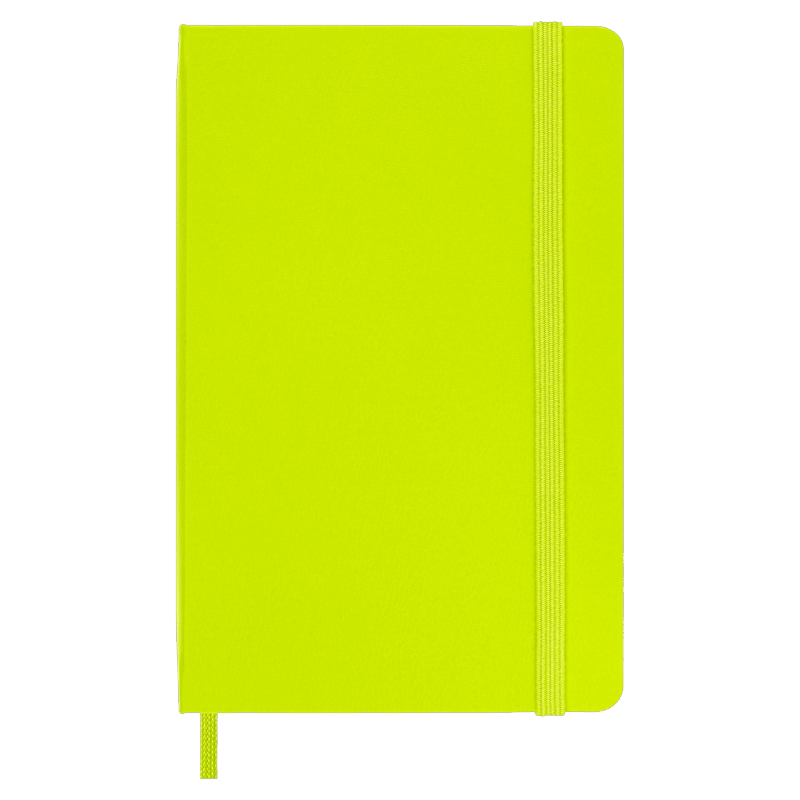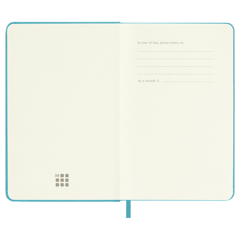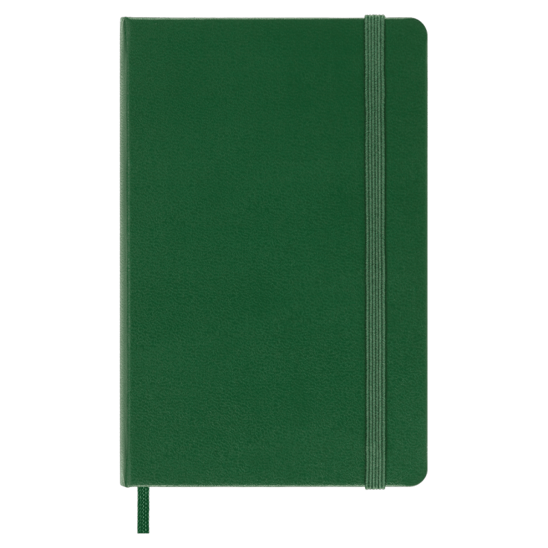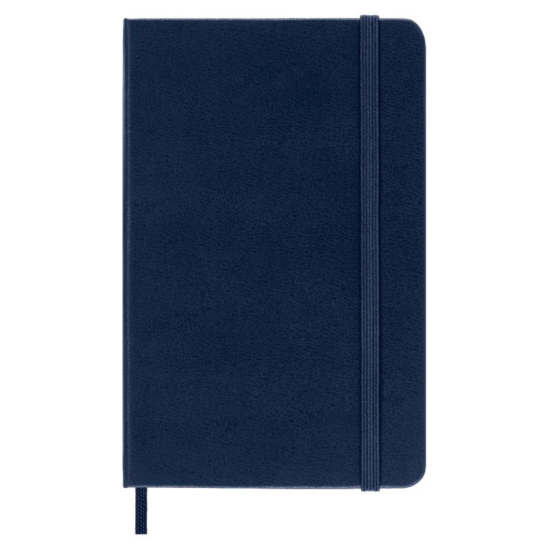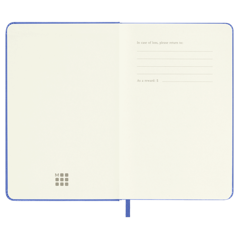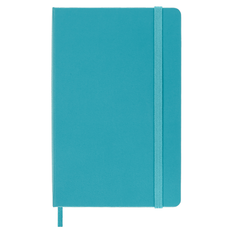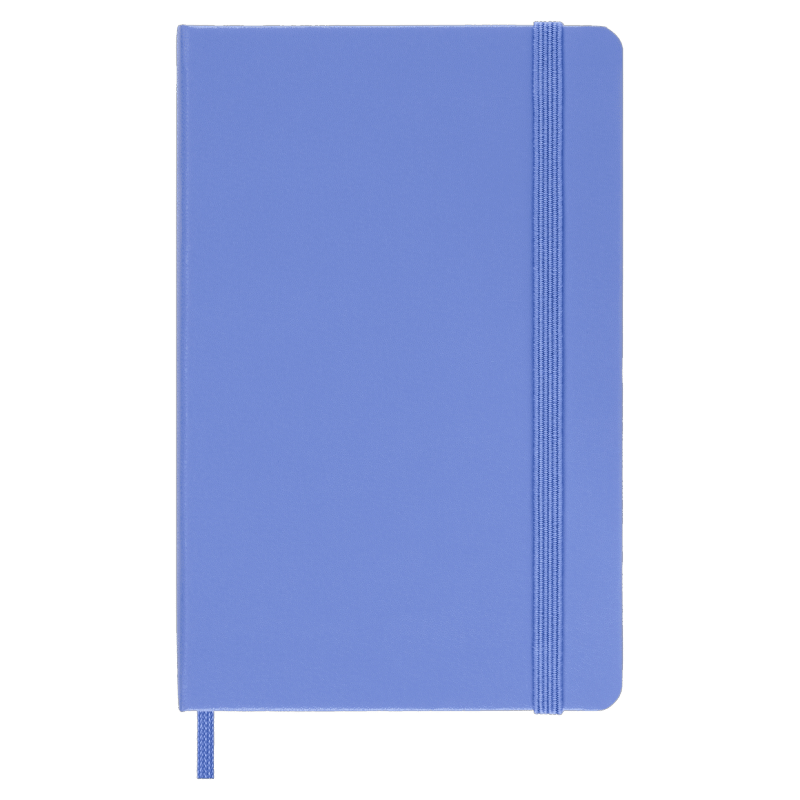 hard cover available in black, red, blue and other colors rounded corners, elastic closure and matching ribbon bookmark ivory-colored, 70