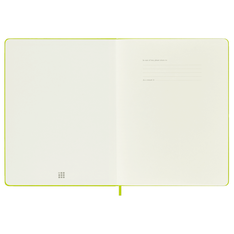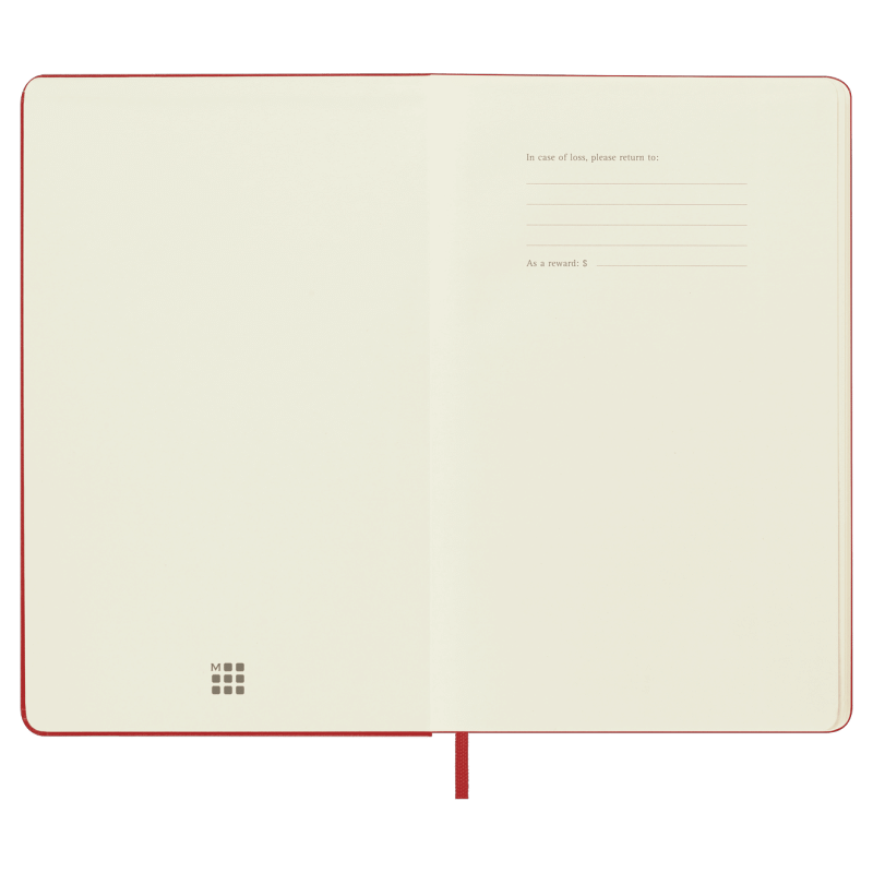 hard cover available in black, red, blue and other colors rounded corners, elastic closure and matching ribbon bookmark ivory-colored, 70