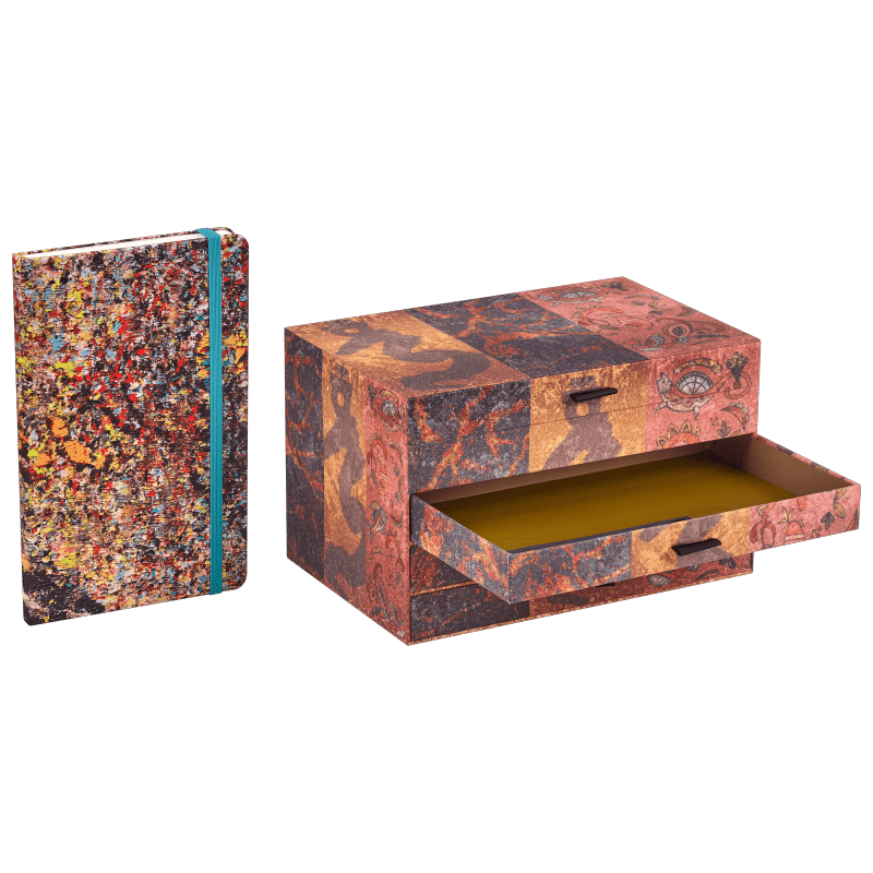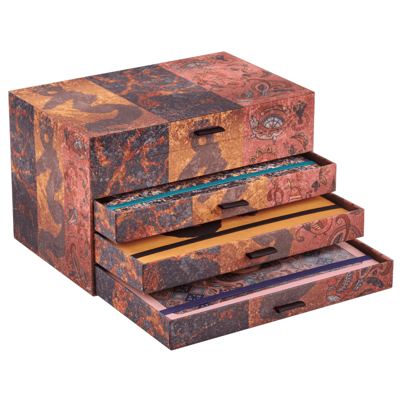 Reusable fabric-covered giftbox with the three artists’ artwork linked together