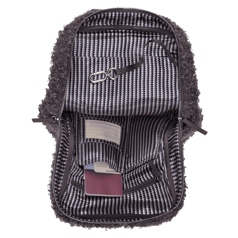 separate lined pouch made from the same textile as the backpack with a second mesh pouch inside