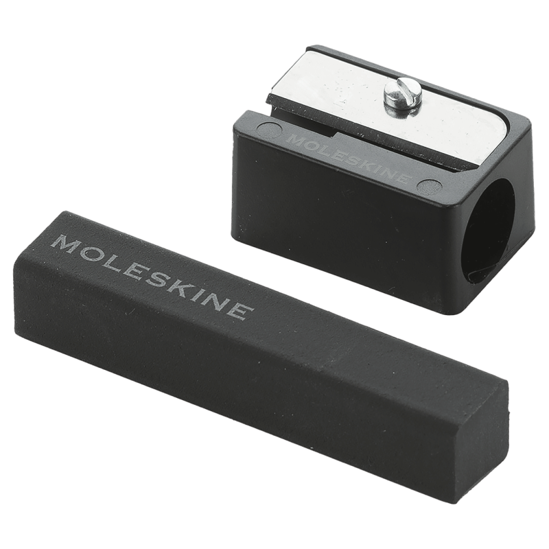 Sharpener: for Moleskine pencils ABS plastic matte black finish high-quality German blade 12.5 mm opening Eraser design echoes Moleskine notebook