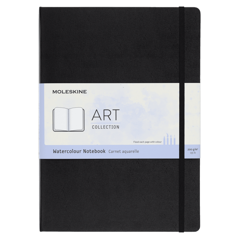 hard cover rounded corners and elastic closure ivory-colored, 200 g/m², acid-free plain paper ‘In case of loss’ notice printed on